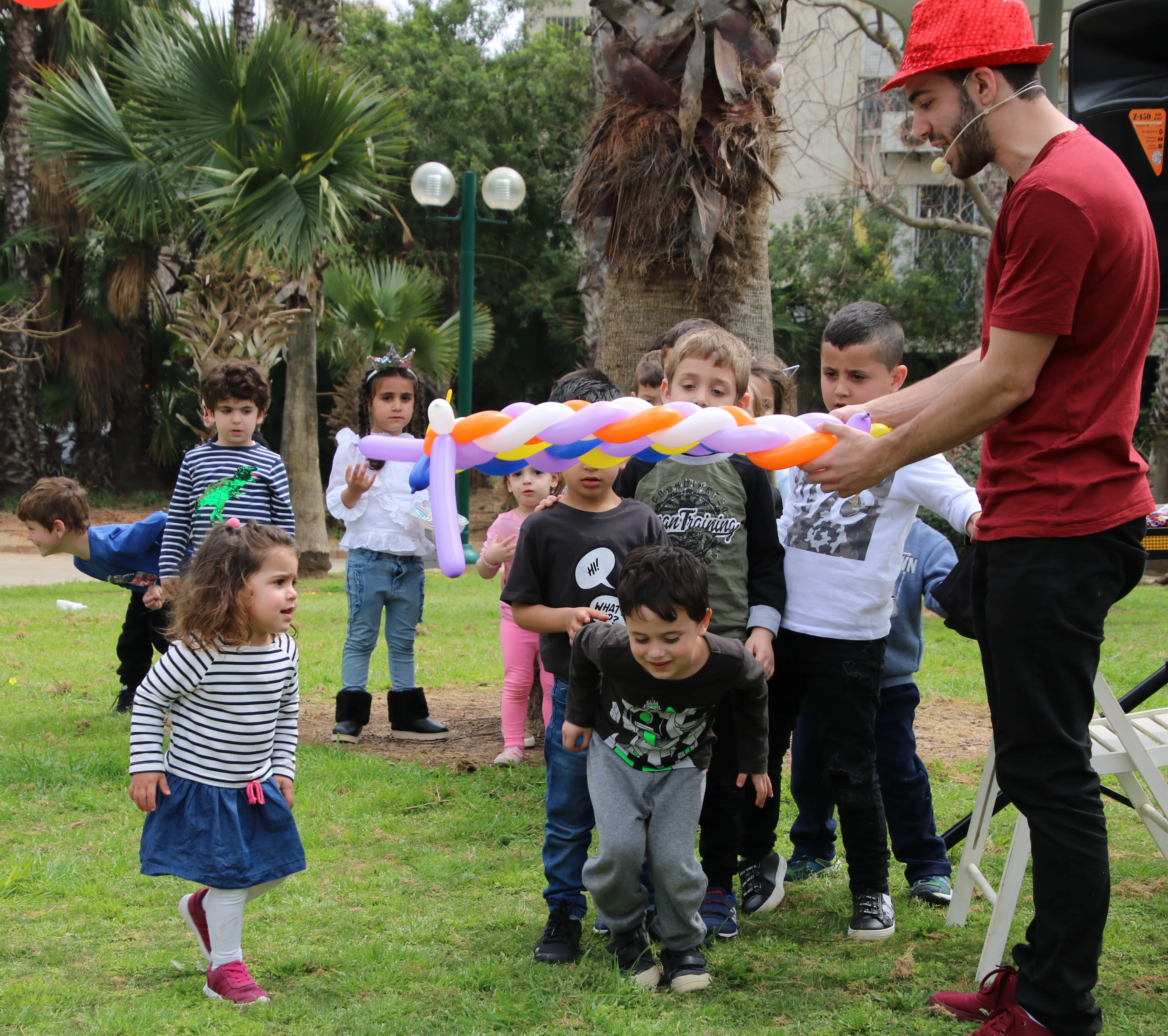 משם אנחנו עוברים למשחקים עם פוף שמרימים את כל הילדים על הרגליים, וכמובן...אי אפשר בלי טקס עוגה ובלונים.